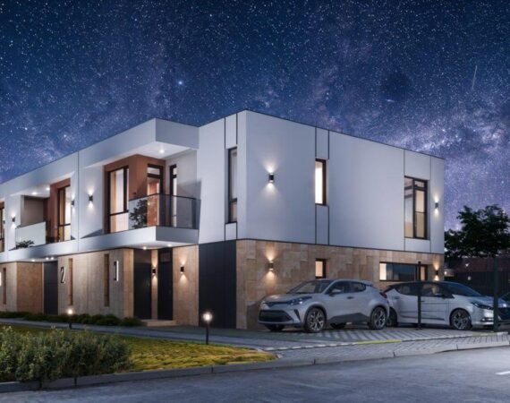 Каждому дому принадлежат 2 парковочных места. В данный момент проект находится на этапе Акт 14 – грубый строительный этап.